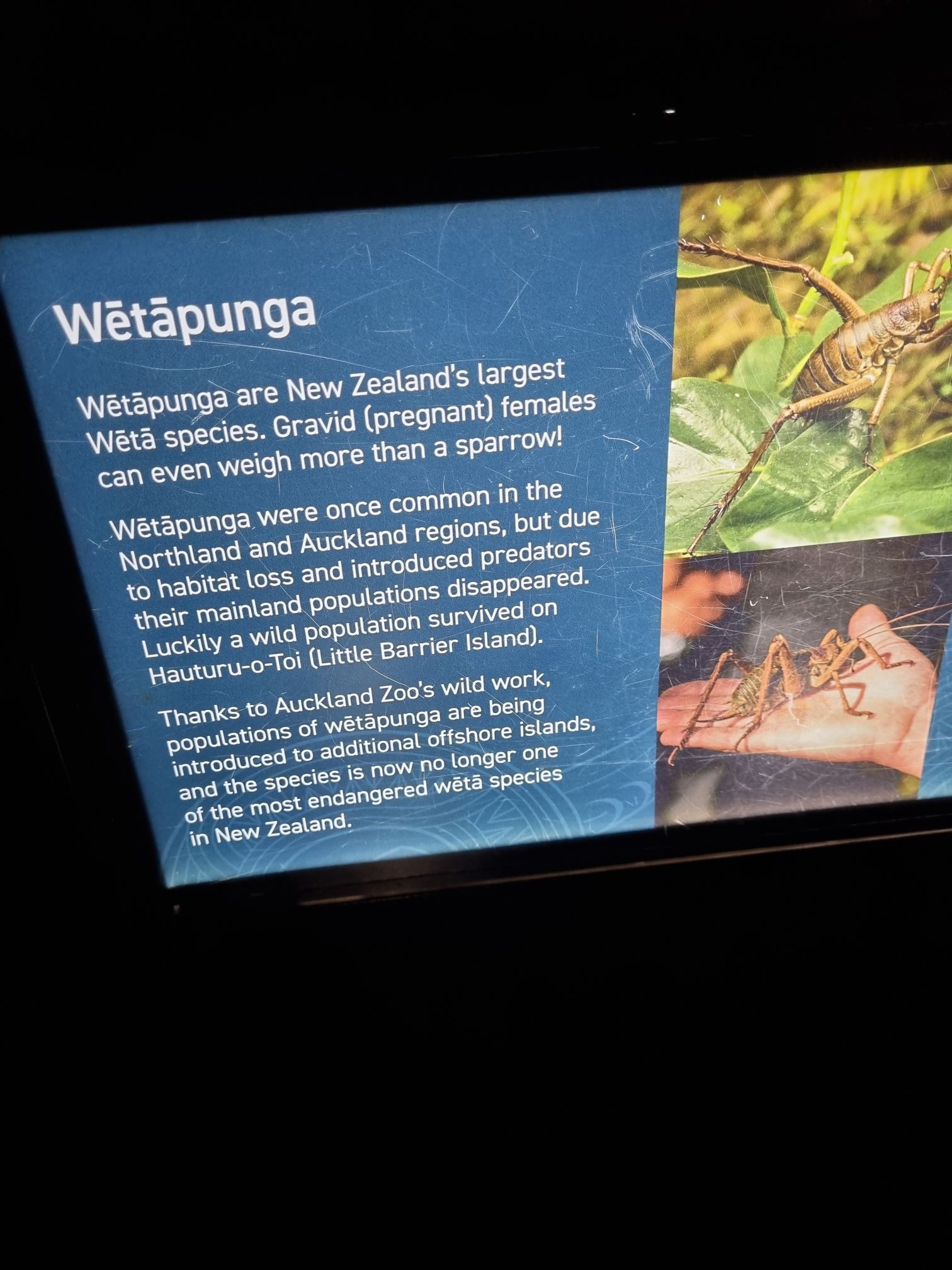 We saw every exhibit, fron the spiders of Australia to a beautiful Gharial. Most importantly, while we couldn’t spot any of the shy, nocturnal kiwis, we DID see a few Wēta’s, particularly Wētapunga’s (Giant Wēta’s). An endangered (though this is changing almost single handedly from work by Auckland Zoo) insect endemic to Aotearoa New Zealand! As an exotics lover…this was beyond cool!