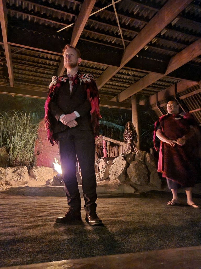…Now, maybe it’s just me, but when I hear “dinner night out and cultural experience”, I think formal, or at least smart! I suited up in a burgundy suit and pink shirt (this is relevant) and headed to the lobby. When I got there, I noticed no one else was wearing anything like me, all good, each to their own! Then Julie came over and said, “Jake, just to let you know, as you’ve dressed so smartly and suavely, you’ve been elected as the Chief for this evening’s ceremony at Mitai.”