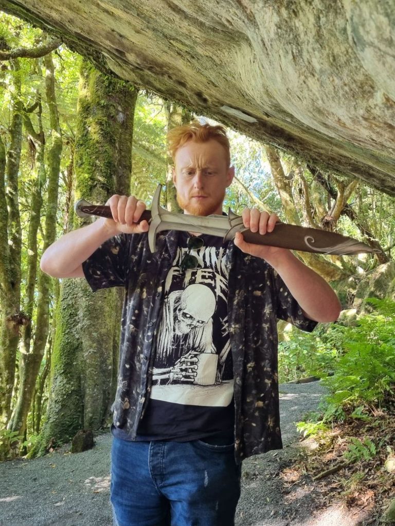 Warwick, by the hoard, pulled Sting (Bilbo’s (later Frodo’s) Elven dagger…or letter opener if you’re Balin) from a pile of leaves and luckily, with the same cheeky energy, he giddily told us he was supposed to only take a group shot (as the second group behind us did), but with extra time, he took a ton of photos with each of us solo.