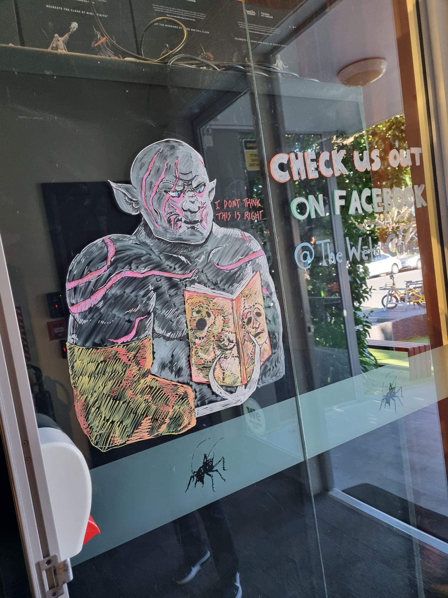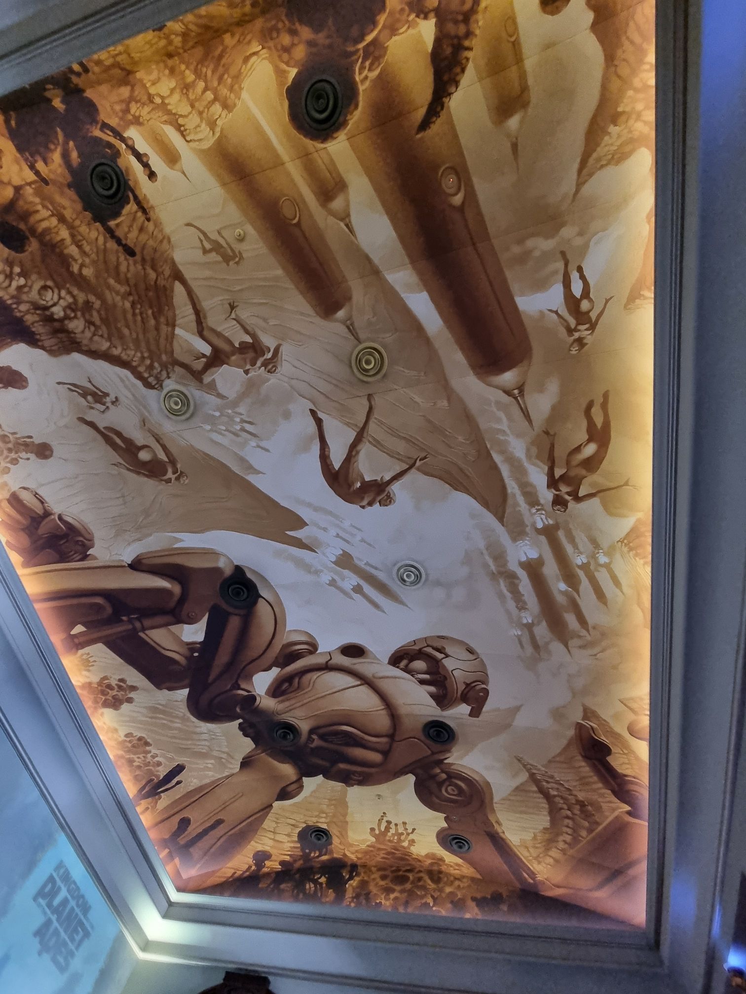 After that, we have the second highlight. Lunch at the Roxy, a preserved Art Deco cinema, helpfully saved and renovated by Richard and Tanya Taylor of Wētā, proof that big money *can** be used well. It was a beautiful building. After a lovely lunch (in which I got a special vegan version with some a-mazing roasties!), we went exploring. The second floor, with a huge painted ceiling, was breathtaking. As an old film graduate, seeing the cinema littered with old posters and projectors, merch and beyond, was perfect.