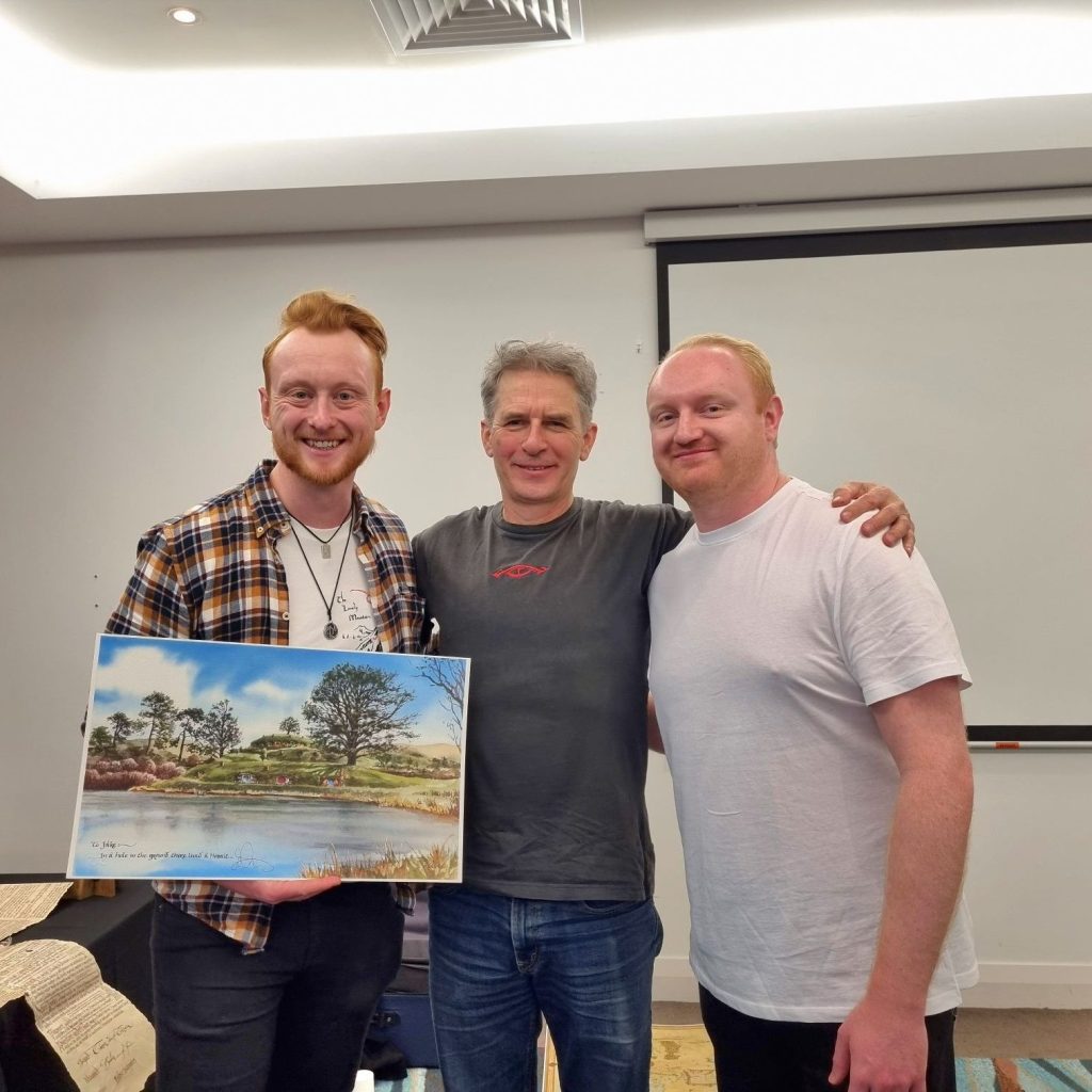After an early wake -up, we sat in a conference room as Daniel gave a gorgeous and in-depth talk about his work, from just lettering his own book covers for the books, aged just 14, to being called by Wētā off the back of a random submission of some Elvish cursive he’d designed all the way to being THE first point of contact for written material for all things Middle-Earth! We then watched him do his skill so masterfully and gracefully on his own watercolour print before we got a chance to buy our own maps and prints to get signed and lettered.