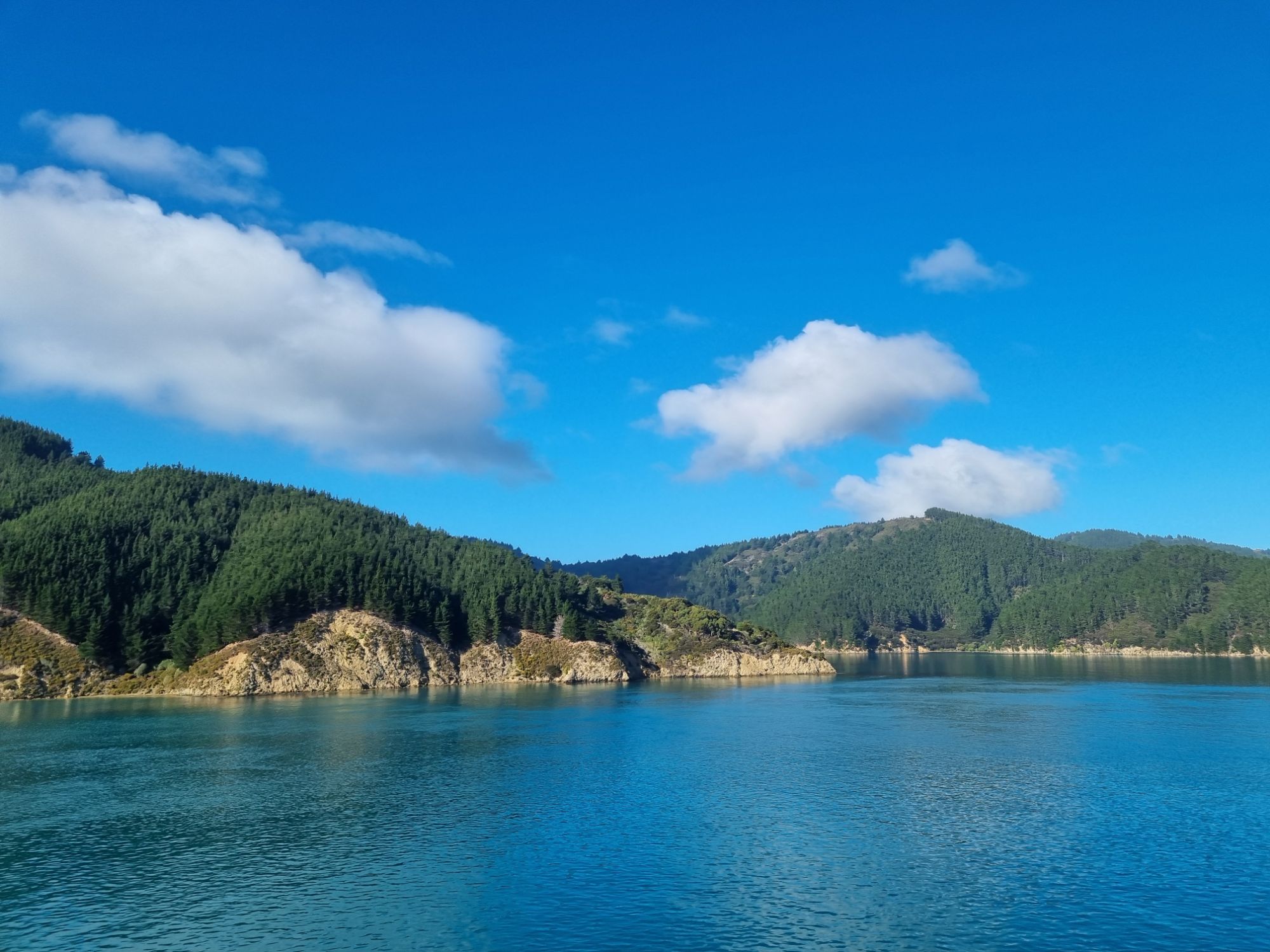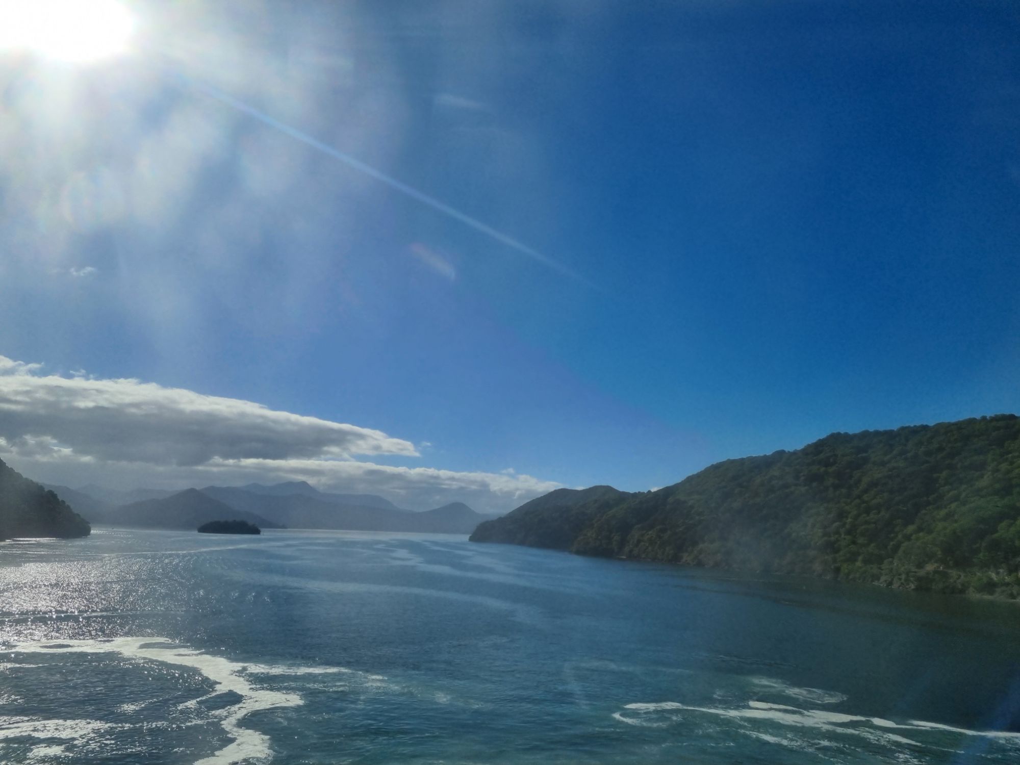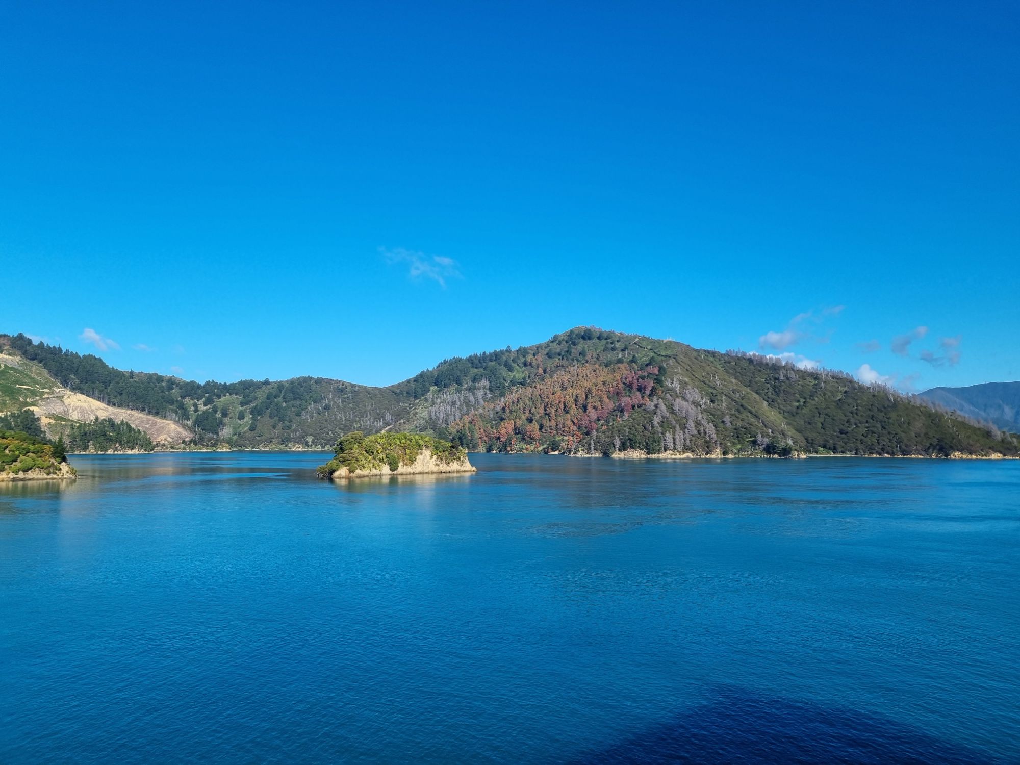 The voyage itself was very smooth, a little choppy after leaving the Bay of Wellington before hitting the Cook Strait, but otherwise, it was comfortable, and the weather outside on the top deck was very warm objectively. McKenzie and I, followed by the others (Jon had to take a moment to look green bordering on translucent first), sat and talked for most of the journey across the Strait, which was wonderful. Especially to start with as being on a tour, we don’t tend to have much time to talk 1-1 with each other. It was nice to get that time. What followed can only be summed up by a lot of photos rather than anything else. We entered the Queen Charlotte Sound and were lost for words at the beauty. Take a Norwegian fjord, add more warmth and a touch of the You Only Live Twice Theme – welcome to the South Island!