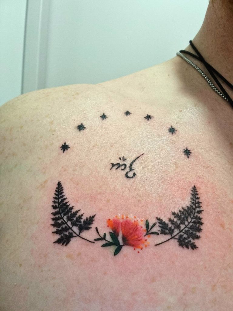 The Seven Stars of Gondor on top; below, two ANZ silver ferns and a pohutukawa flower for Kiwi and Māori culture.